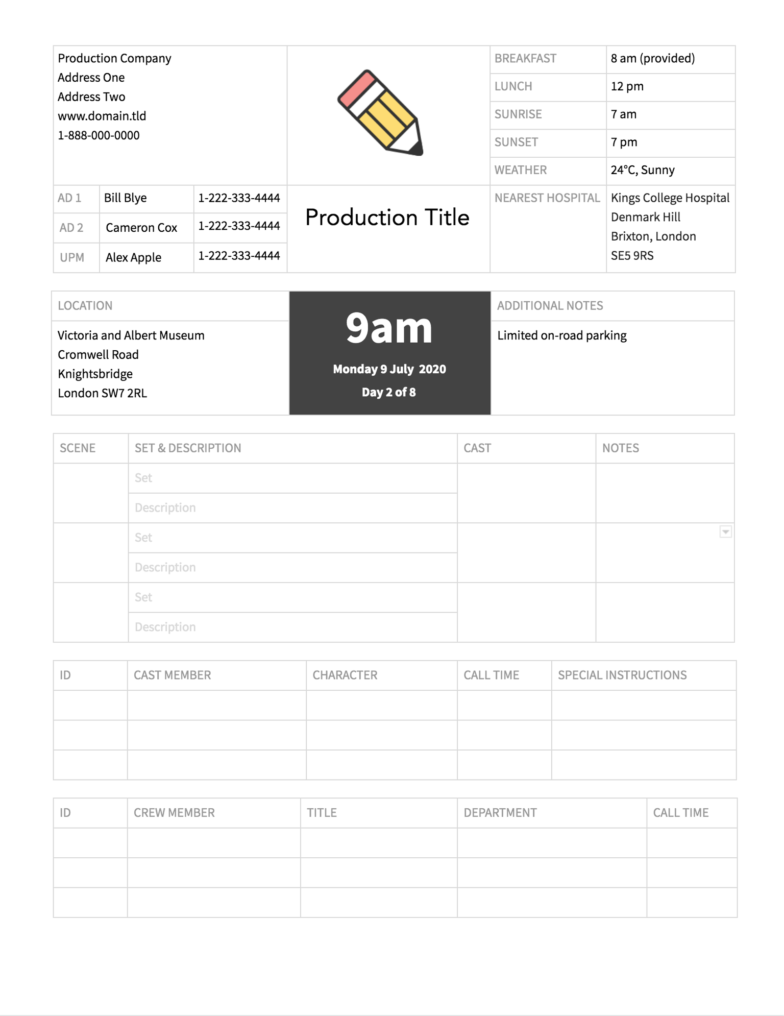 It's no good having the weather forecast if you don't know where you're going. Under set location on your call sheet template, you might want to include the address of where the crew will be based, rather than the actual shooting location. If you have multiple locations, label each one with a number: Location 1, Location 2, etc.