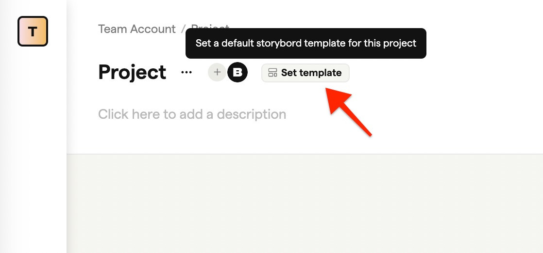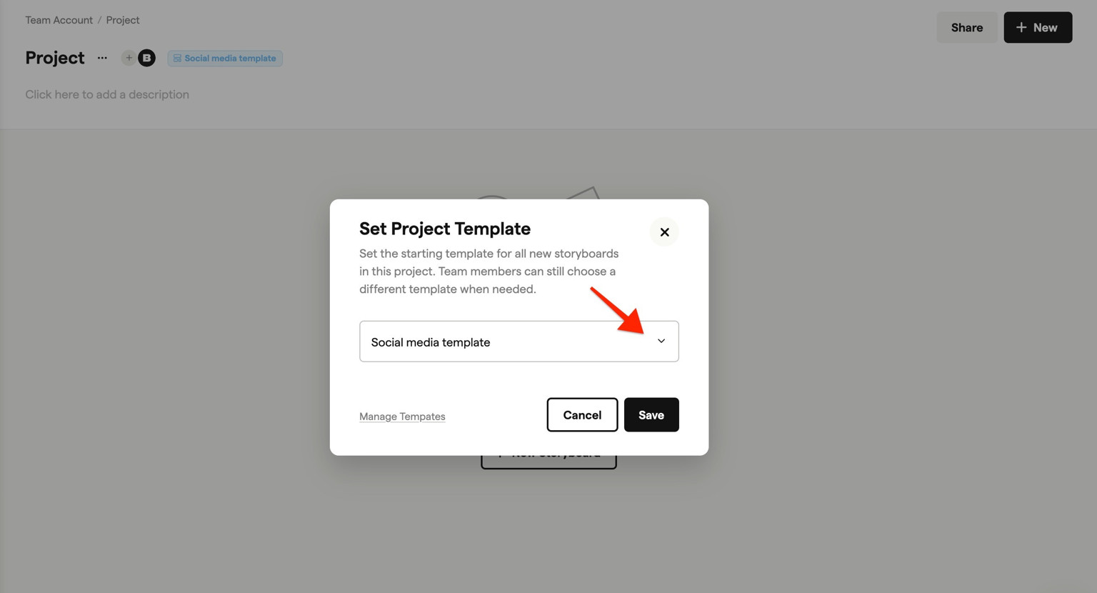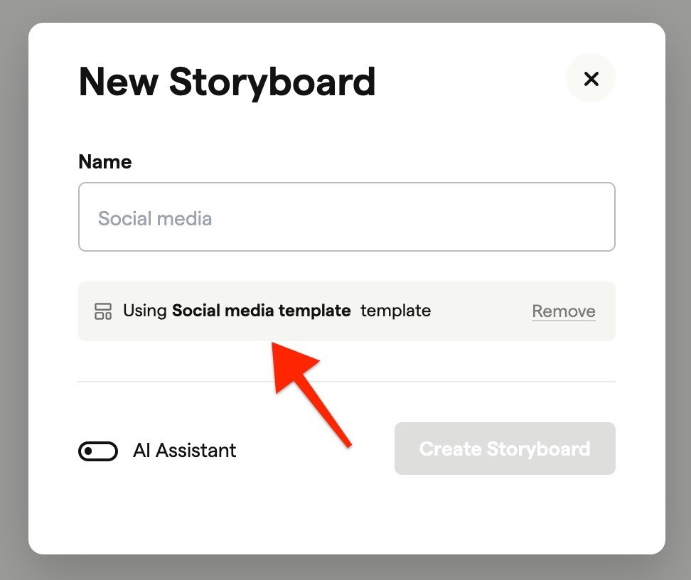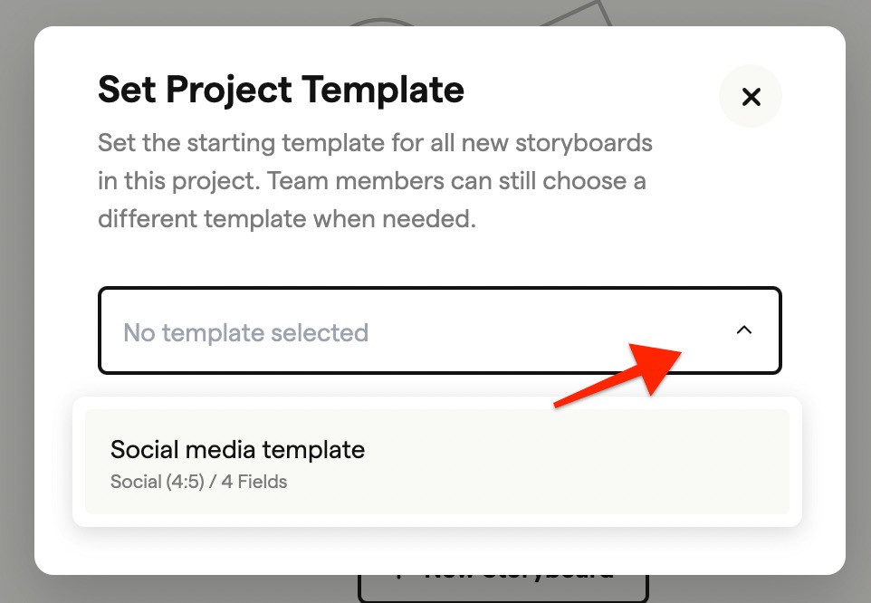 If the project has a template assigned (shown in blue at the top), that template applies automatically to new storyboards.