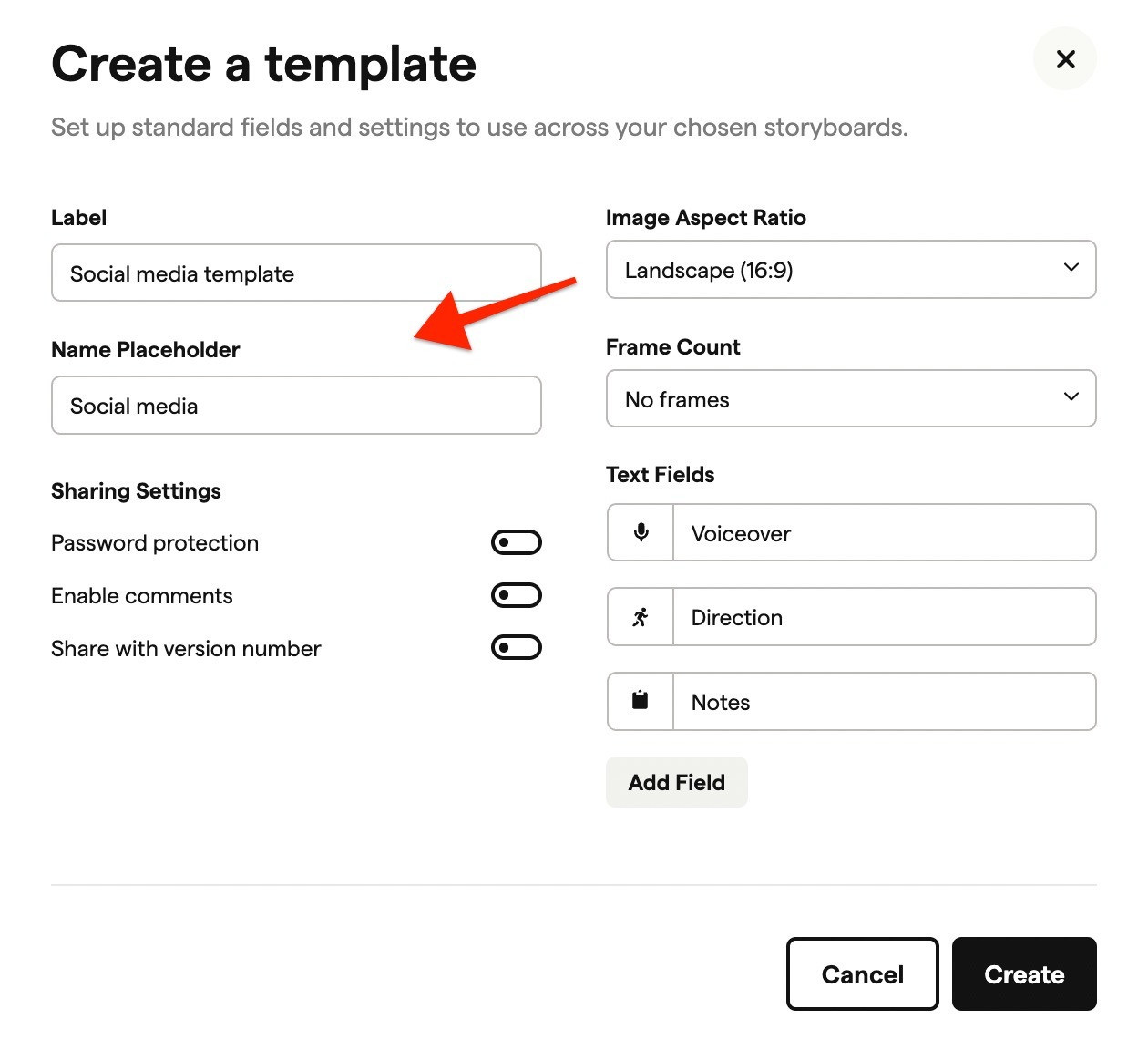Label and Name Placeholder: Give your template a label to identify it (e.g. "Client A - TV Spots"), and set a name placeholder to prompt consistent storyboard naming.